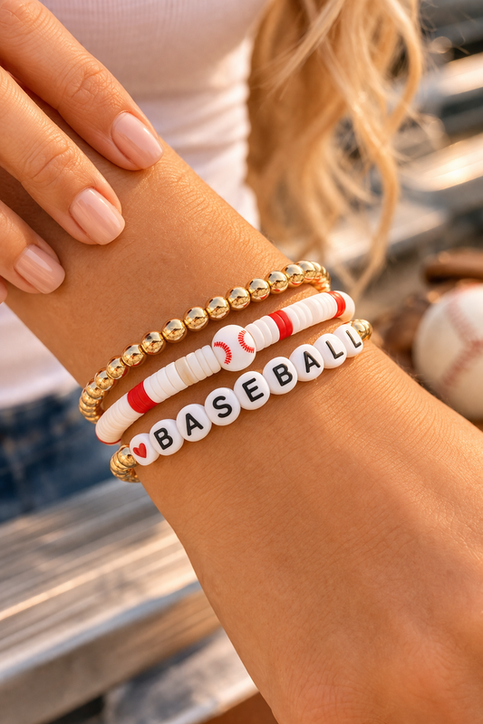 Baseball Love Stack Bracelet Set Gold Beaded Stretch Bracelets with Letter Charm
