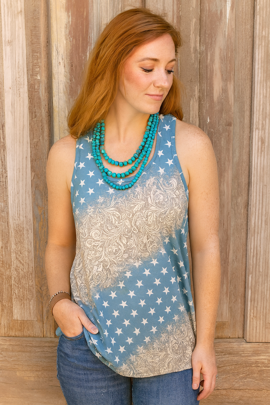 A fun mixture of faux embossed tool and vintage washed stars. This is a relaxed fit top and some might say oversized. Pair with a bralette for a different style and a pop of color.