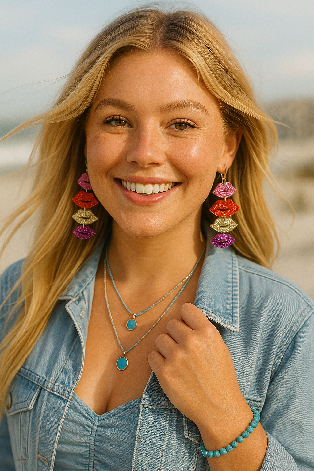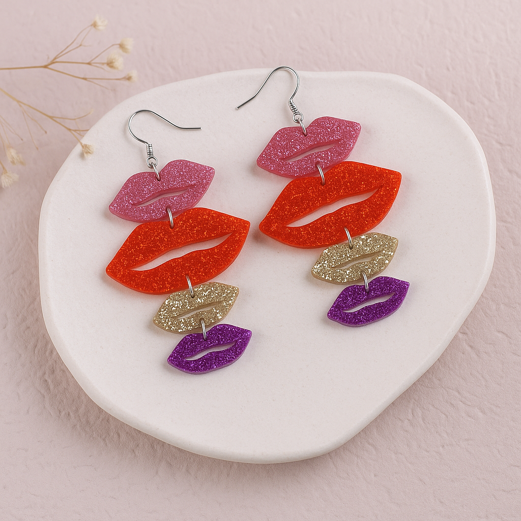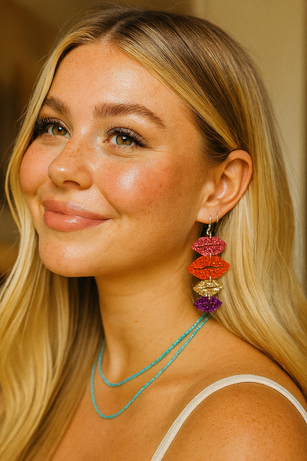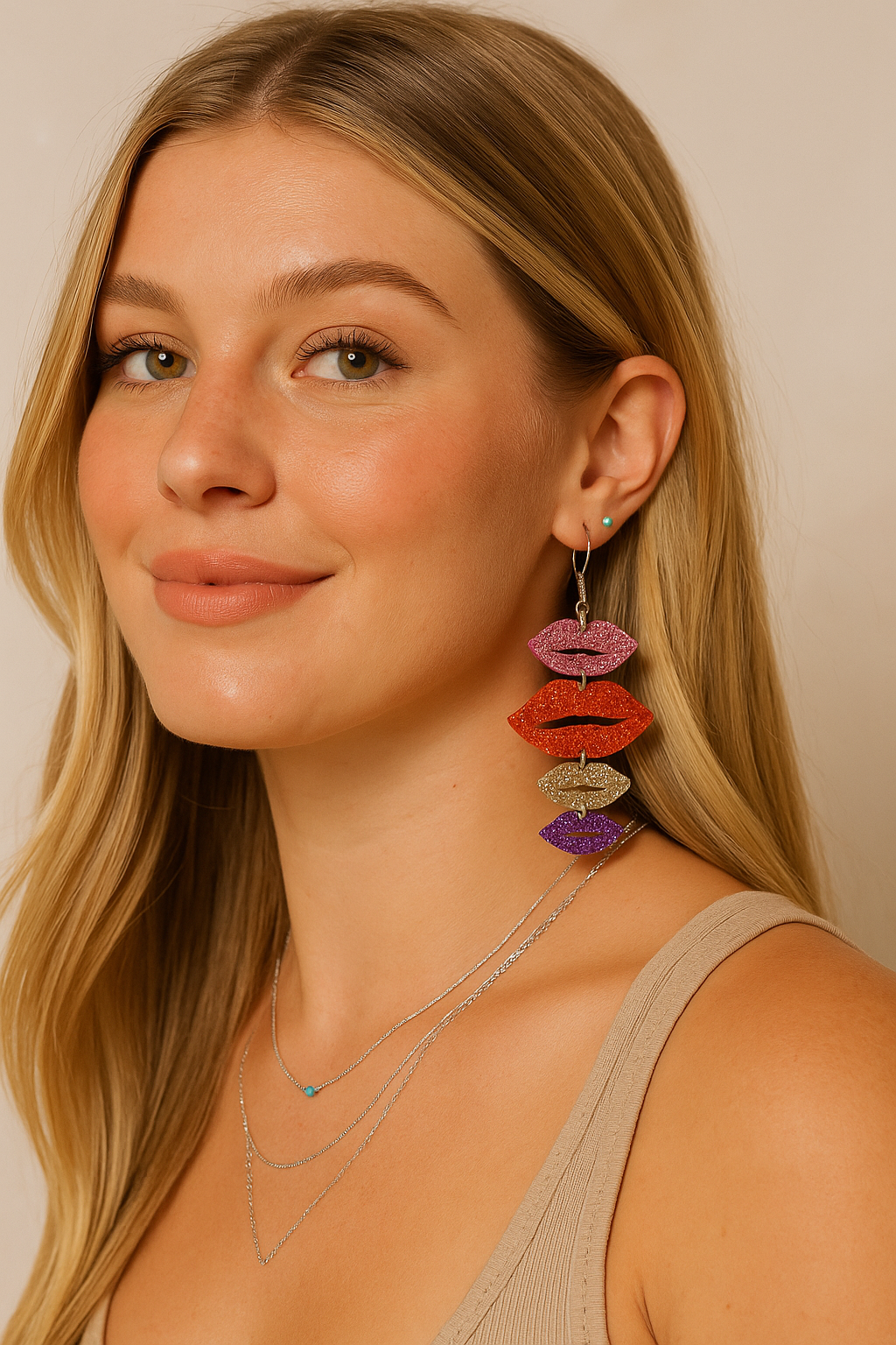 Each earring features four cascading glitter lips in pink, red, gold, and purple – designed to sparkle from every angle. Lightweight and sassy, they’re perfect for your next girls' night, concert look, or that outfit that just needs a little extra.