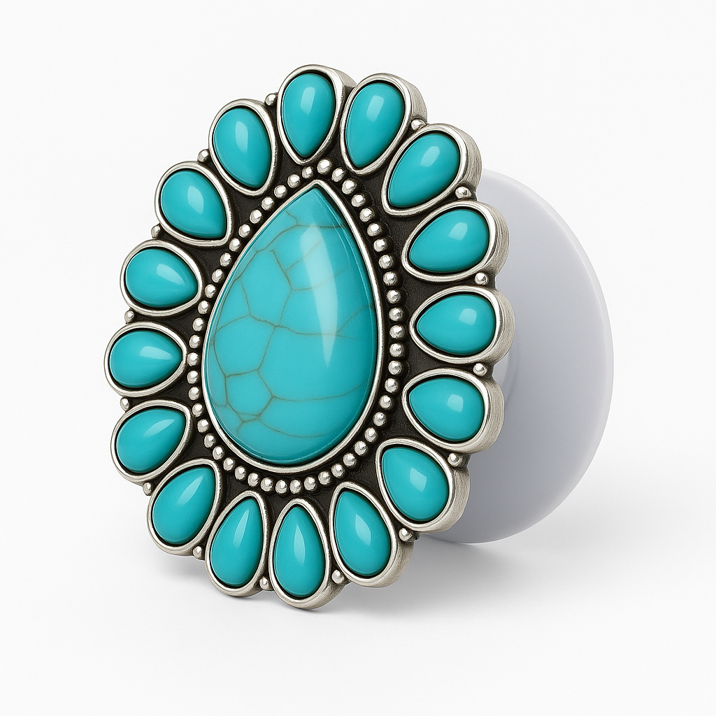 Meet your new rodeo-ready essential. The Dakota Drop Grip captures the spirit of the wild west with a stunning faux turquoise teardrop stone framed in antique silver detailing. Designed for everyday cowgirls who crave a little sparkle, it adds that perfect touch of western glam to your phone while keeping your grip strong and steady — from the saddle to Saturday night lights.